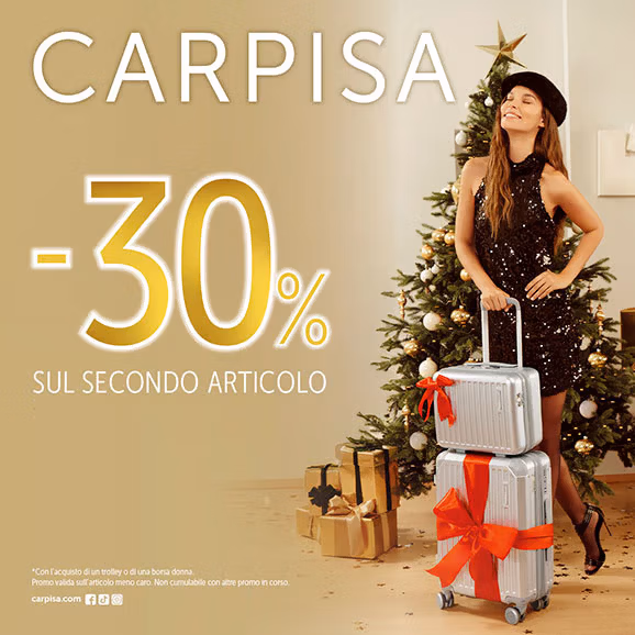 Da Carpisa un regalo tira l’altro! Approfitta della nostra promo: con l’acquisto di un articolo, il secondo è tuo con il -30% di sconto! Lasciati ispirare dalle nostre collezioni e trova il regalo perfetto. Ti aspettiamo in store. CONDIZIONI: *con l’acquisto di un trolley o una borsa. Valido sull’articolo meno caro. Non cumulabile con altre promo in corso.