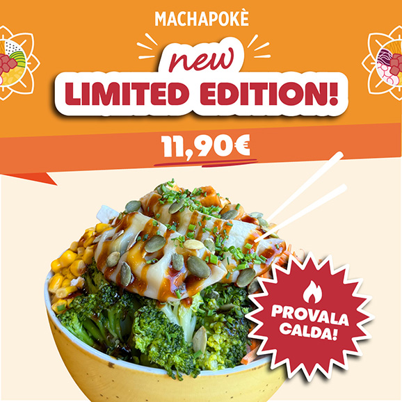 Una novità tutta da gustare: la nuova Limited Edition MACHAPOKÈ! Riso sushi, gyoza pollo e verdure, pollo teriyaki, feta, carote, mais, broccoli, erba cipollina, semi di zucca, salsa teriyaki. Da gustare anche calda! Che aspetti? Corri da MACHAPOKÈ!