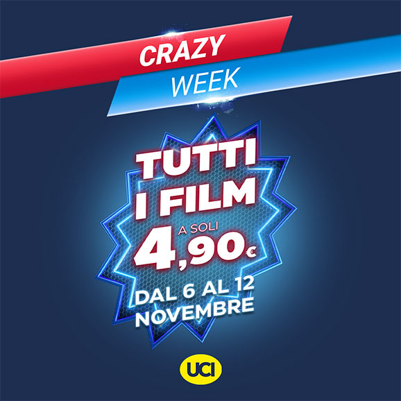 CRAZY WEEK UCI CINEMAS Dal 6 al 12 novembre, tutti i film in 2D sono a un prezzo super speciale! 4,90€ nei cinema UCI Una settimana intera per goderti il cinema al massimo, ogni giorno, a un prezzo mini! Scegli il tuo film, prenota il tuo posto e vivi la magia del grande schermo! Il film Ne Zha - L'ascesa del guerriero di fuoco e le sale iSense, IMAX, ScreenX, le proiezioni in 3D e gli eventi speciali sono esclusi dalla promo.